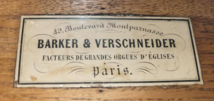 Charles Spackman Barker (1804-1879) est né à Bath, au Royaume-Uni. Après des études de la médecine, il se tourne vers de la facture d’orgues et se forme à Londres. Très vite, il s’interresse aux perfectionnements nouveaux de la facture d’orgues, ce qui le conduit à mettre au point l’invention de la célèbre machine à Barker qu’il a introduit à Paris en 1837, à l’invitation de Cavaillé-Coll. Il est ensuite devenu co-directeur de la société Daublaine-Callinet en 1841. Il dirigea la reconstruction de l’orgue de St Eustache en 1844 et la rénovation de l’orgue de Saint Sulpice en 1846. La société Daublaine-Callinet fut rachetée par la compagnie de Pierre- Alexandre Ducroquet en 1845 avec lequel il s’associa. En 1855, la société fut rachetée par Joseph Merklin. Barker occupa son poste jusqu’en 1857, date où il commença sa propre entreprise avec l’aasociation de son ancien contremaître Charles Verschneider (1825-1865). Il a construit deux orgues à Paris (église Saint-Pierre-Saint-Pierre- de-Montrouge et Saint Augustin) et a rénové l’orgue de Lesclop à Notre-Dame-des-Victoires en 1870. Tous, ont été modifiés. Il quitta la France pendant la guerre de 1870 et s’installa à Dublin, où il a construit l’orgue de la cathédrale. Il est décédé en 1879.